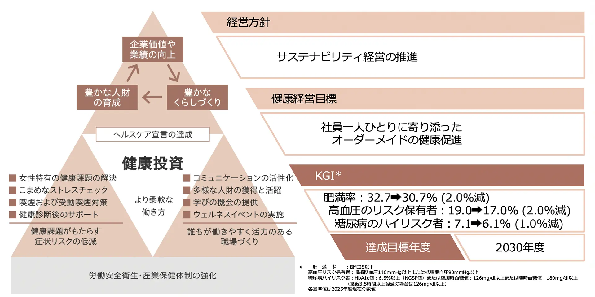 従業員一人ひとりが年代や性別ごとに多様なライフステージに向き合って活躍していることを会社が尊重し、従業員自ら健康を自律的・積極的に管理する職場づくりを目指し、健康増進に関する様々な取り組みや情報発信を通じて従業員をサポートしています。